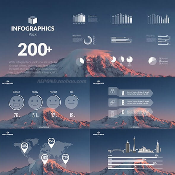包含信息图表、图标、图形、信息标签、地图、进程、服务、社交媒体、表格、时间线、连线标注、字幕排版等;自定义修改文字内容、数值参数、颜色等等。