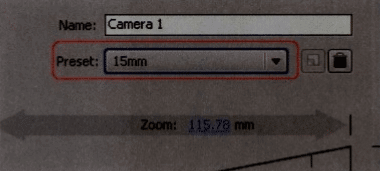 09 在时间线窗口的空白处单击鼠标右键,在弹出的快捷菜单中选择New>Camera[新建>摄影机]命令,在Camera Settings [摄影机设置] 对话框中,将Preset [预设置 ]设置为“15mm”焦距的广角摄影机,如图所示。