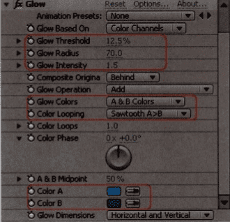 将Glow Colors (发光色彩)设置为“A&B Colors ( AB色)”,也就是允许指定A和B两种色彩对层进行发光处理;将Color Looping (色彩循环)设置为“Sawtooth A>B”,即以A为光源色,逐渐衰减为B色;设置Color A为青色,Color B为蓝色,即光源发出青色光,
