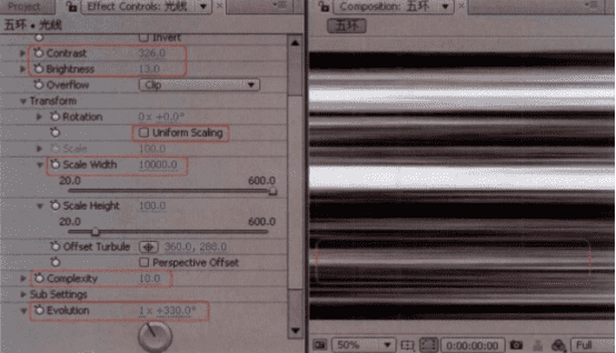 04 设置Contrast (对比度)值为“38.0” ,Brightpess (亮度)值为“13.0″,增强噪波的对比度。展开Transform (变换)栏,取消勾选Uniform Scaling(统一缩放)选项,我们需要对噪波的水平和垂直方向单独进行缩放。将Scale Width(缩放宽度)值设置为n“0000.0,可以看到噪波已经被拉伸为水平条状,这样噪波的形态就基本完成了。