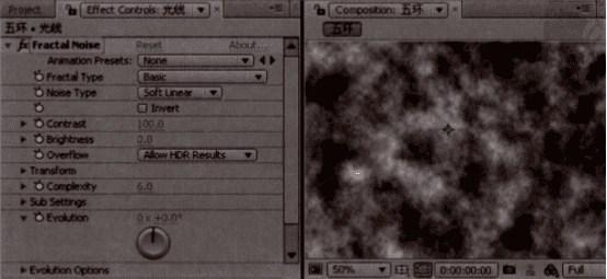 03 本次教程中我们将通过调整噪波来得到光线的雏形。执行菜单栏中的Effect> Noise &Grain> Fractal 1 Noise [特效>噪波与杂质>分形噪波]命令,添加噪波特效,如图所示。目前噪波的默认形态与我们想要的效果有一定的差距,我们需要一个线状的、明暗细节丰富的噪波。