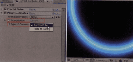 06 执行菜单栏中的Effect > Distort > Polar Coordinates [特效>扭曲>极坐标]命令,将Interpolation (插值)值设置为“100.0%”,将Type of Convers (转换类型)设置为”Rect to Polar (平面坐标到极坐标)”,如图(左)所示。极坐标是常用坐标系中的一种,这里使用这个命令将平面坐标系转换为极坐标系,则可以将线条扭曲成一个环形,如图(右)所示。