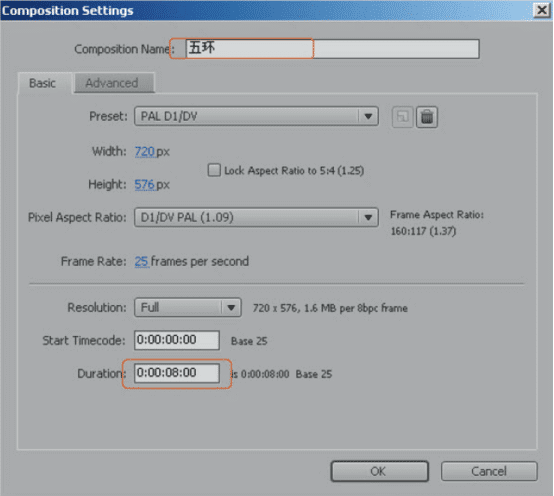 01 执行菜 单栏中的Composition > New Composition[合成>新建合成]命令。在弹出的Composition Settings [合成设置]对话框中,将Composition Name [合成名称]设置为“五环”,将Duration[合成时间]设置为“0:00:08:00” ,单击OK按钮建立新合成,如图所示。