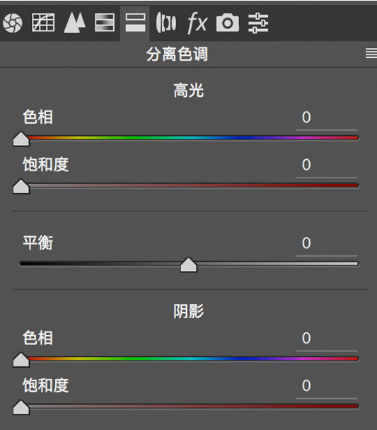 分离色调工具一共有5个调整滑块,从上到下依次为高光色相、高光饱和度、平衡、阴影色相、阴影饱和度。