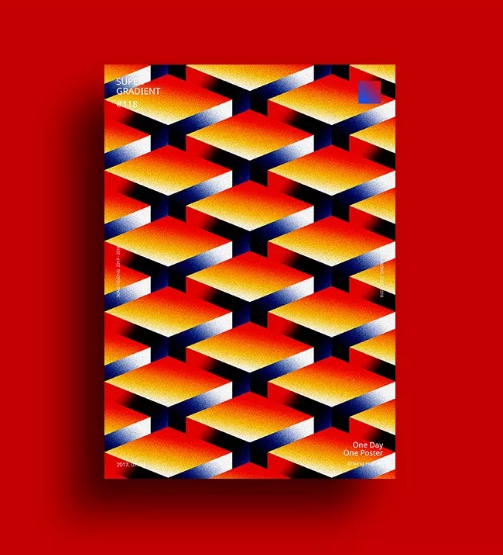 今天, 我们所选择的海报非常有意思,通过一个个形状的堆叠,形成一个类似3D风格的海报,就像是一个个凸出的立方体,我觉得特别有意思,在颜色的搭配上,是热情似火的红黄渐变,搭配上纯净冷酷的蓝色。