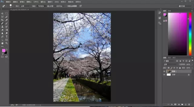 在樱花位置拉出粉红色,底部则拉出橙色。