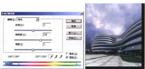 01用[魔棒工具]将画面中的玻璃选择出来,然后在[图层]面板中按Ctri+J快捷键复制一层,命名为“玻璃”,然后打开[色相/饱和度]对话框,在[编辑]栏中选择青色,然后拾取玻璃的颜色,同时将[饱和度]的值设置为39,如下图(左)所示。