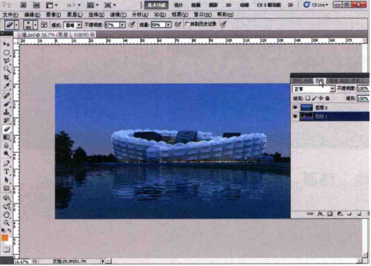 07根据步骤4的方法为建筑也制作一个在水面上假反射的效果,同时添加柔光].[透明度],以及[动感模糊]等效果,可根据自己的需求适当调节各个参数,这里就不详细讲解了,最终效果如下图(右)所示。