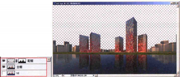 01在 Photoshop中打开上一节中渲染好的光子图、彩色通道图及配楼图,即配套光盘tga中的”td.tga”、“成图 tga”和“配楼,tga”文件,在Photoshop中将3张图合并到一张图上,并分别命名,如下图所示。