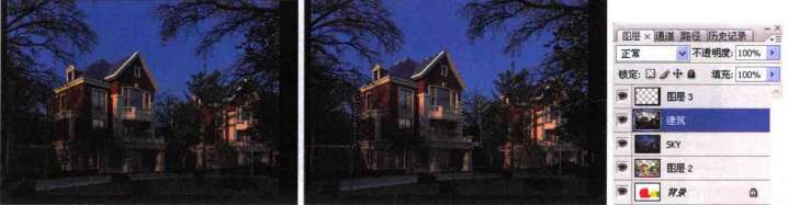 03调整天空颜色,使其有一个渐变的过程,即左侧稍亮,右侧稍暗。首先在通道栏中将建筑与天空分离出来,如下图(中)所示;然后通过彩色通道将建筑及配景选择出来,并复制(按CtritJ快捷键)到新的图层(建筑层)中,如下图(右)所示。