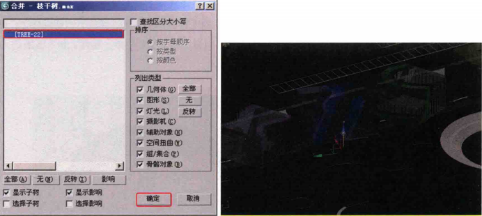 01执行[文件]1[合并]命令,在打开的[合并文件]对话框中找到配套光盘提供的”DVDIscenel第10章写意风格表现配景模型枝干树.max”文件,单击[打开]按钮,在弹出的[合并一枝干树.max]对话框中选择[TREE-22],单击[确定]按钮,将其导入进来,如下图(左)所示。
