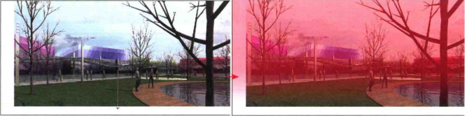06 打开配套光盘”DVDIscenel第10章写意风格表现后期素材”中的”配景.psd”文件,如下图(左)所示,选择其“图层5副本”,将其拖曳到“写意风格表现.psd”中,如下图(右)所示。