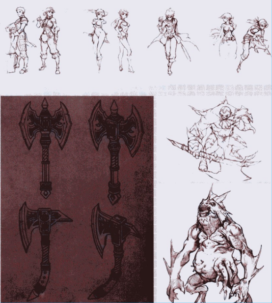 下图所示为次时代游戏暗黑血统中主角武器的形态设定,其中就使用了剪影的效果来制作武器的形态,从中可以感受到多种武器带给我们的不同的感觉,有震撼的,有秀气的,有厚重的….