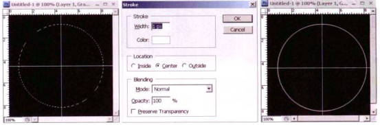02 新建一个图层,按Ctrl+ R键使用标尺找到该图像的中心点定位。按下AIt键的同时使用圆形选择工具拖出一个适当大小的圆,如下图(左)所示;在其所选区域任意位置单击鼠标右键,从弹出的下拉列表中打开Stroke (描边)对话框,按下图(中)所示进行设置,效果如下图(右)所示。