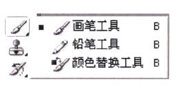 如果你随便找一位画家,问他在工作中用得最多的工具是什么?他一定会斩钉截铁地回答:“画笔!”用电脑画画也不例外,任何一款绘画软件都带有画笔工具,画笔的作用是至关重要的。它就像我们中国人吃饭用到的筷子,而画家就是靠画笔来“吃饭”的。Photoshop的画笔工具有3种,分别是默认的画笔工具、扩展的铅笔工具和颜色替换工具,如图所示。