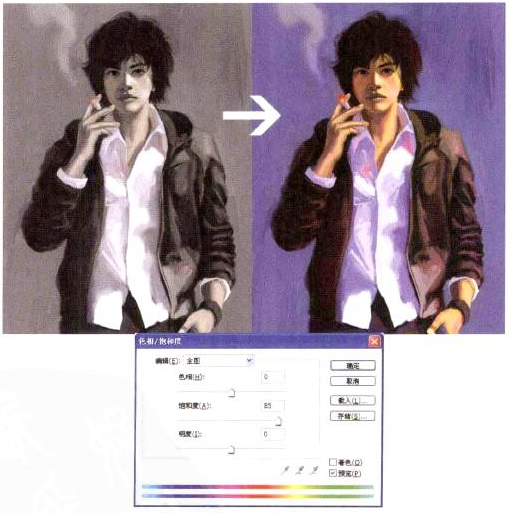 色相/饱和度(Ctrl+U) :此命令包含了对色彩三大属性色相、饱和度(纯度)以及明度的调节。其特点是既可以对单独颜色进行三大属性的调整也可以对全图进行调整,大多数情况下是对全图进行调整,如图所示。