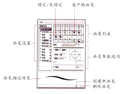 锁定/未锁定:显示锁定图标时,表示当前画笔的笔尖属性为锁定状态,单击即可解锁成未锁定状态。选中的画笔:当前选择的画笔笔尖。