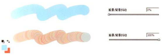 前景/背景抖动:用来控制前景色和背景色在笔迹中的变化。该数值越小,笔迹颜色越接近前景色,如果数值为0,就完全是前景色;数值越大,笔迹颜色越接近背景色,如图所示。