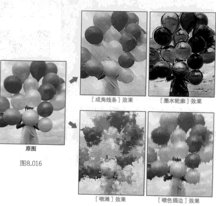 使用图像的主导色,用成角的、喷溅的颜色线条重新绘画图像,效果如图8.016所示。要注意的是