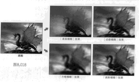 这两种滤镜一般用于将图像中有显著颜色变化的地方消除杂色。[模糊]滤镜通过平衡清晰边缘旁边的像素,使颜色的过渡显得更加柔和:[进一步模糊]滤镜的功能与[模糊]滤镜相似,但是模糊效果要强3-4倍,如图8.019所示。