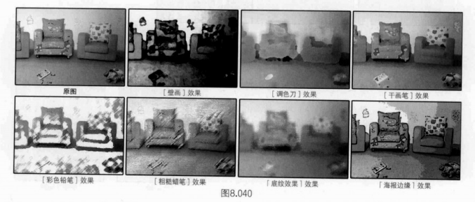 减少图像中的细节以生成描绘得很淡的画布效果,可以显示出下面的纹理,效果如图8.040所示。