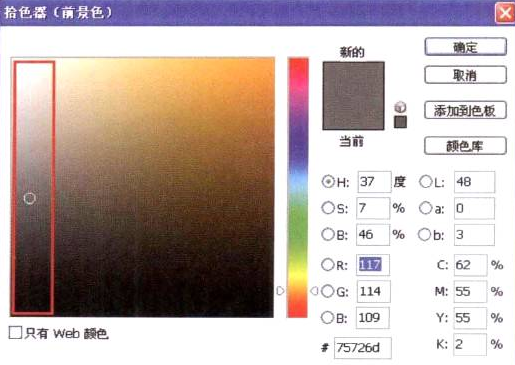 1启形:运行Photoshop软件,新建一张画布,然后选择用“拾色器”选择前景色,如图所示。注意标示出来的红色框,这幅画的取色基本上都是在这个区域内,由于画的是石膏像,最终效果要接近素描的感觉,因此整体色彩要求纯度偏低。