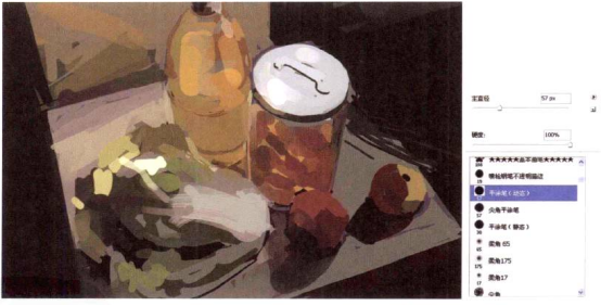 使用“颜色动态笔3”这个笔刷来强化物体的质感,特别是苹果,因为这两个苹果已经有些干巴了,表皮有些粗糙,因此我在“画笔预设”里选择了“颜色动态”,这样画出来不但有丰富的质.感,而且有微妙的色彩变化,可以营造出油画的手绘效果。当然,这里还得配合“柔化”笔来柔化边缘,例如,苹果的投影。画笔的完美搭配让画面越来越接近真实,如图所示。