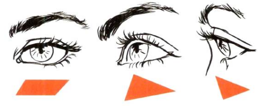 说一个人变老了,会说他/她都有“鱼尾纹”了。为什么要叫眼角周围的皱纹为鱼尾纹呢?因为眼睛就像一只鱼, 而外眼角的皱纹就像鱼的尾巴,所以就这么叫了。这个比喻是很形象的。其实可以更简单地去理解眼睛的外形。眼睛的外形从正面看很像一个平行四边形,侧转-定角度后又变成了三角形,转至正侧面,三角形的外形又变了,如图所示。