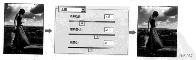 在默认情况下,[色相/饱和度]对话框中默认为[全图]模式,我们只需要对下面选项中的滑块进行拖动,或直接输入数值即可,直到达到满意的效果,如图6.037所示。