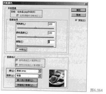 存储统计数据:可以将当前设置保存下来,以便调用。下面我们来介绍几种匹配颜色的方法。刚才我们提到了[匹配颜色]命令可以将一个图像的颜色与另一个图像中的颜色相匹配,现在我们来看看是怎样进行操作的,如图6.066所示。