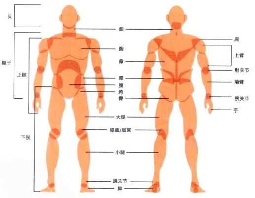 人体外形以脊椎为中线呈左右对称的布局,是通过骨骼、关节、肌肉等组织连结而构成的完整有机体。人体的外形分为头、躯干、上肢以及下肢4个主要部分,每个部分又延展了各自的小部分。其中躯干由颈部、胸部、腹部、背部及腰部5个部分组成;上肢由上臂、肘关节、前臂、腕关节及手所组成;下肢由髋部、大腿、膝关节、小腿、踝关节以及脚所组成,如图所示。