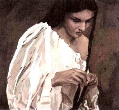 3修整:参考图片的头发披到前面,感觉较为琐碎,为了让整个画面有一种整体的宁静感,只有把它们都盖住了。这一步我还对面部与手部都做了更深的细化。不知大家看到这里有没有发现一个规律,很多时候我都喜欢在上色时用一些小笔触蘸些颜色在画中来一次蜻蜓点水,然后将这些突兀的颜色润开。