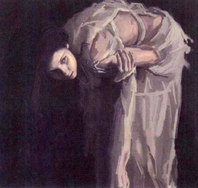 有关衣服的处理,第一要有耐心,如果有颗浮躁的心,时刻想走捷径,那是很不可取的;第二要把衣服的块面分成简单的明暗块面,至于后面如何细化,那会相对简单许多;第三要明白衣服的质感,譬如图片中的衣服应该属于那种薄纱类的材质,所以通透感较好,但是也不是很透明的,所以在处理时要把暗处的某些区域的反光交代清楚,就当在处理一个哑光的玻璃瓶,如图所示。试想一下,如果把衣服处理得很明亮,那么还会有那种浸泡在背景中的感觉吗?