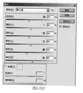 执行[图像>调整>黑白]菜单命令可以打开[黑白]对话框,如图6.092所示。