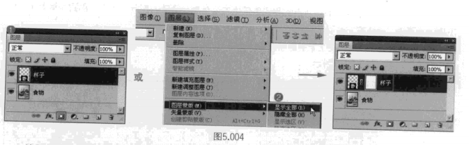 ②选择将要添加图层蒙版的图层,执行[團层>图层蒙版>显示全部]菜单命令,即可为此图层添加蒙版,如图5.004(右)所示。