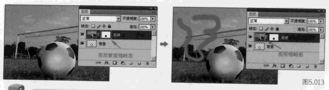 我们可以在【工具】面板中选择/[画笔]工具对图层或者图层蒙版进行编辑。如果要编辑的是图层蒙版,首先单击【图层】面板中的图层蒙版缩略图,使之成为可用状态,这时蒙版缩略图的周围将出现一个边框,表示可以选择任一编辑或绘画工具进行编辑了。如果要编辑的是图层而不是图层蒙版,同样单击【图层】面板中的图层缩略图,使之成为可用状态,这时图层缩略图的周围也将出现一个边框,表示可以在图层上进行涂抹,并且不会影响到图层蒙版,如图5.013所示。