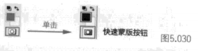 如果我们创建了选区,可以通过单击【工具】面板中的Q[快速蒙版模式]按钮进入快速蒙版模式,[快速蒙版模式]按钮的具体位置就在前景色与背景色下面。当进行切换时按钮会发生一些微小的变化,【工具】面板中的色板自动变成黑白色,如图5.030所示。