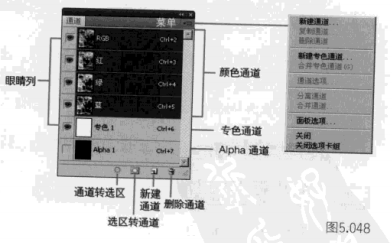 【通道】面板中会列出图像的所有通道,对于RGB.CMYK和Lab图像,将最先列出复合通道,通道内容的缩略图显示在通道名称的左侧,在编辑通道时会自动更新缩略图,如图5.048所示.