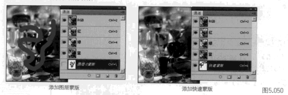 谈到Alpha通道,首先要弄清它与蒙版之间的关系,实质上蒙版是作为通道信息进行存储的,大家可以在【通道】面板中找到它。当选择了带有图层蒙版的图层时,【通道】面板会多出一个为临时通道的名称,如图5.050所示,在【通道】面板中添加图层蒙版,多出的是“图层蒙版”通道;添加快速蒙版,多出的是“快速蒙版”通道,并且可以对其进行与通道有关的任何操作。关于通道的介绍我们会在下面的内容中进行详细的讲解.