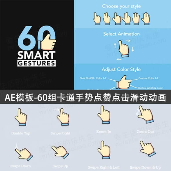 60组MG卡通手势点赞点击滑动动画特效 AE模板