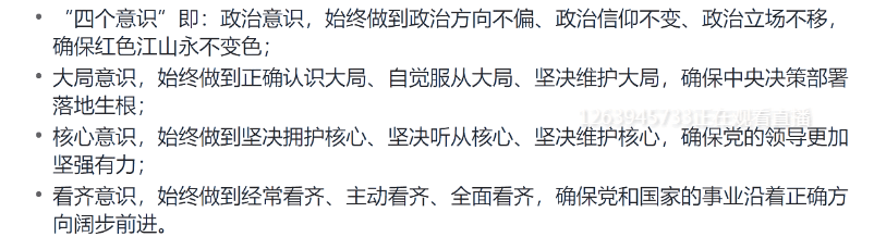 - 新发展理念,两步走,新时代主要矛盾,四个意识(政治、核心、大局、看齐)