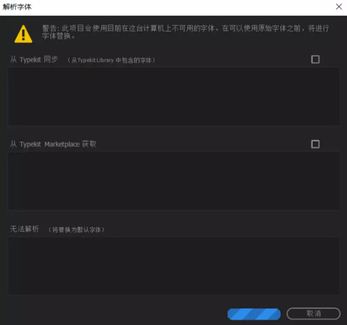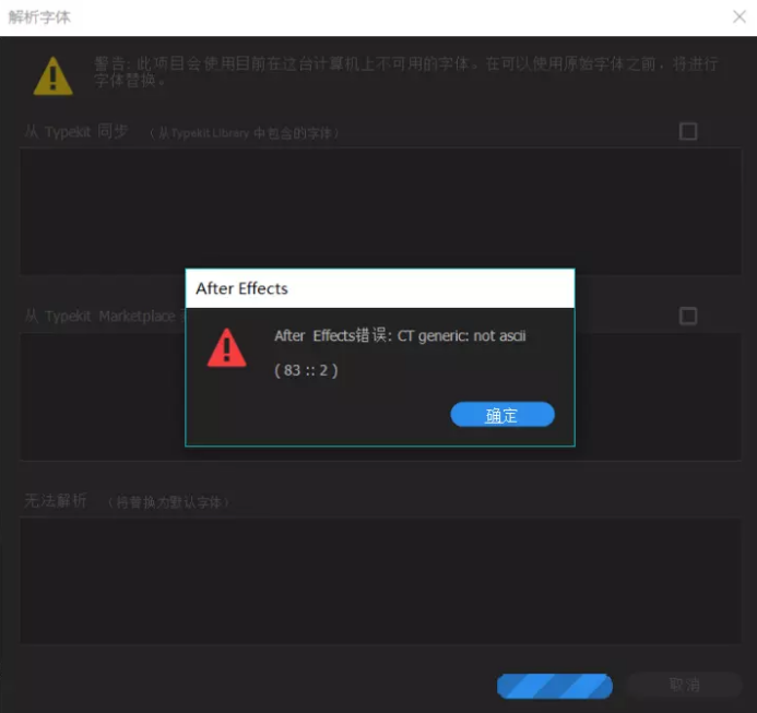 原因:本机中安装的某些字体属于不标准字体,ADOBE公司的CC2018版AE对这些字体不识别解决办法:1.换个软件版本打开(低版本)2.换个模板3.卸载电脑中安装的不标准字体。(通过将软件中的字体切换为英文版,若字体没有被转化为英文,则该字体有问题,会导致报错)此方式仅可预防,提醒自己不使用该字体,对于别人使用了不标准字体的模板无能为力