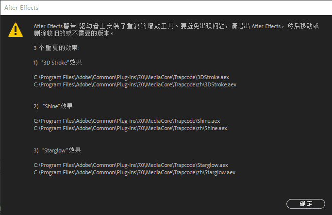 After Effects警告:驱动器上安装了重复的增效工具。要避免出现问题,请退出After Effects,然后移动或删除较旧的或不需要的版本。